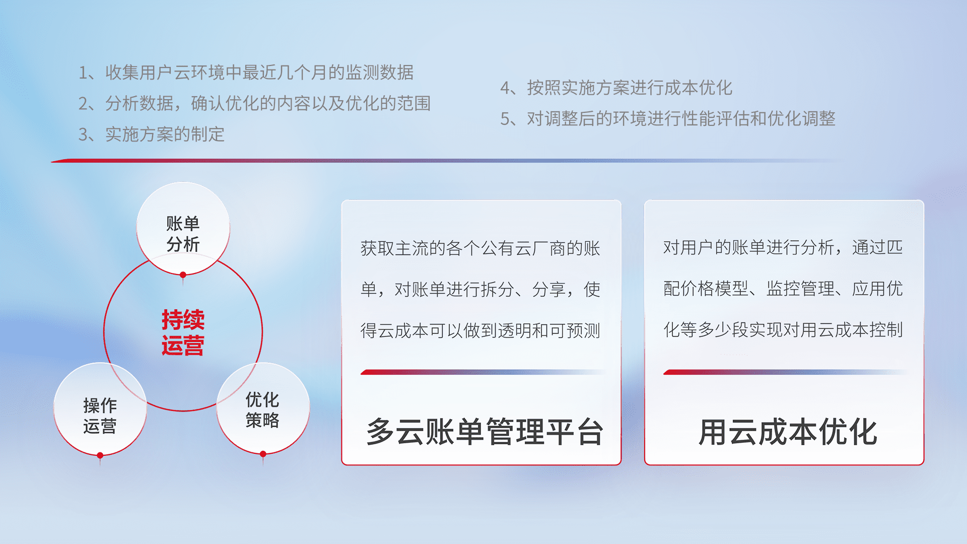 通过多云纳管,,,,以统一的资源数据模型把客户的云资源进行抽象和封装,,,进而实现对多云资源的统一操作,,,,保障云资源管理的可靠性、、、、稳定性与可用性。。。。量身定制化运维内容,,配置、、、开发运维、、、、补丁管理、、备份、、监控、、、、认证和访问管理、、、、审计和日常巡检等,,保障在用云过程中的可靠度,,稳定度以及高可用率。。。