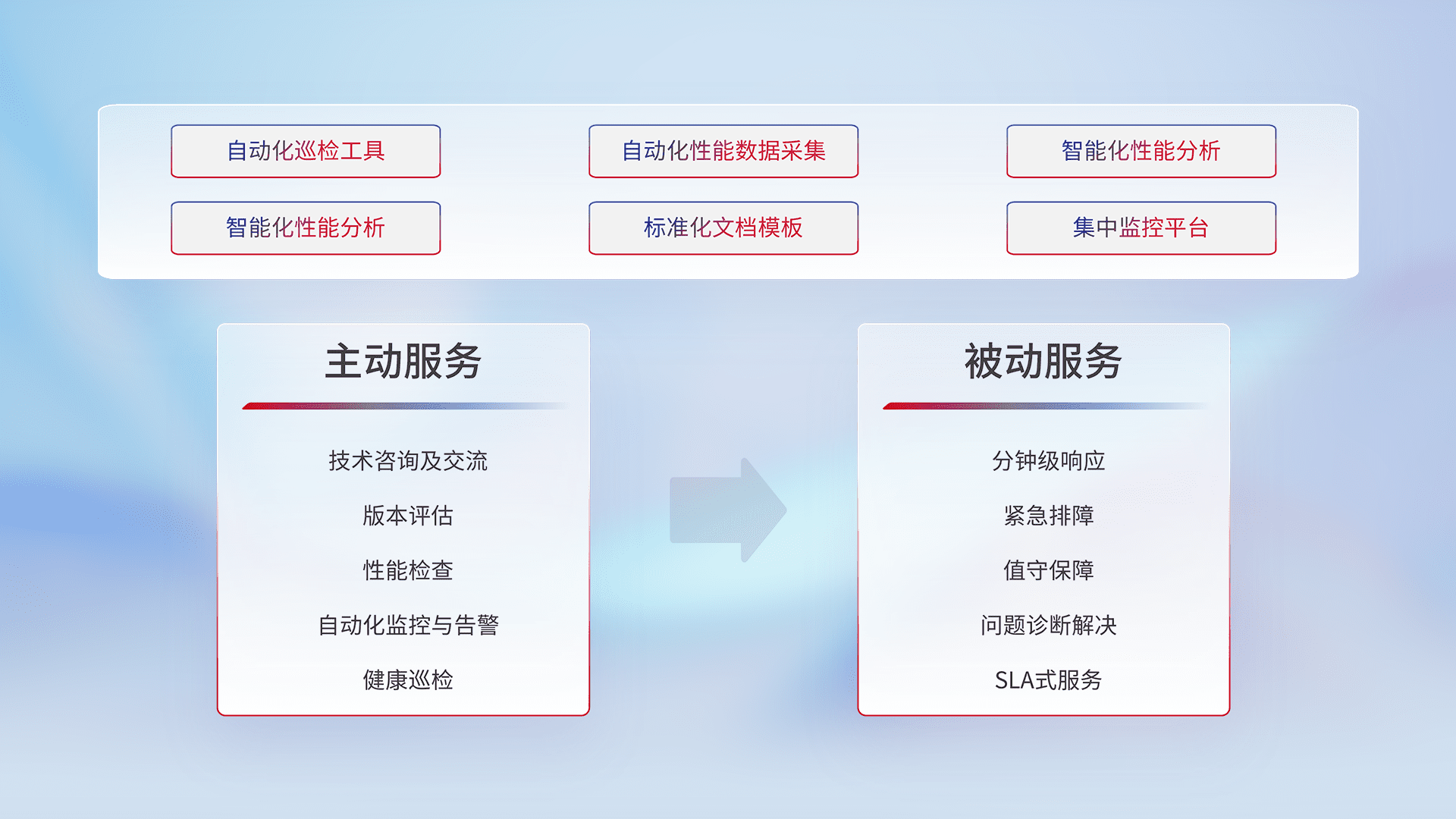 智能化工具和标准化文档,,保障服务质量,,提供主动服务(包含技术咨询、、、版本评估、、性能检查、、自动化监控与告警、、、、健康巡检)和被动服务包含(分钟级响应、、、、紧急排障、、、、值守保障、、问题诊断解决、、、、SLA服务)。。。