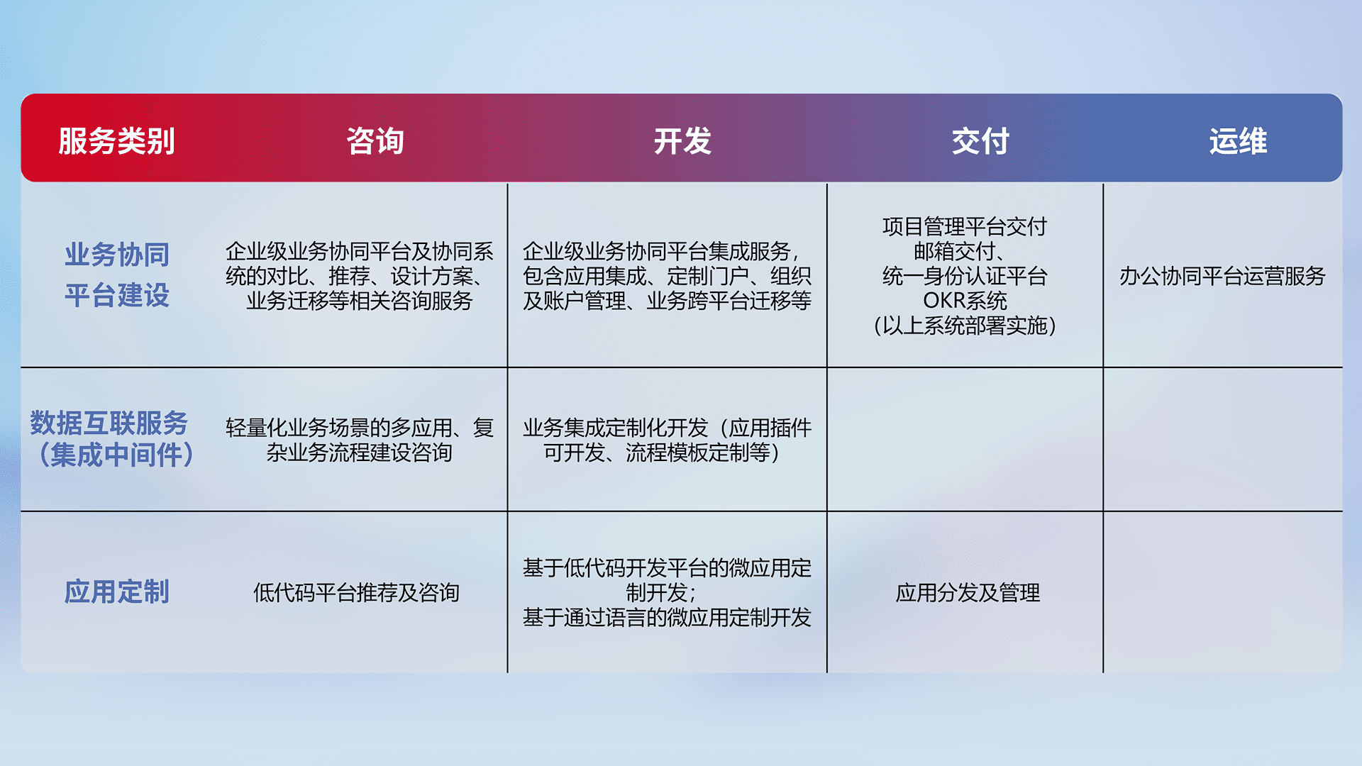 针对钉钉、、、企微、、、、IDaas等平台级产品提供产品的规划、、、、方案、、、交付、、定制化开发等服务,,,,实现如统一协同办公、、智能客户服务、、、、混合会议管理、、、、智能数据查询、、、、等业务场景,,实现数字化转型。。。。